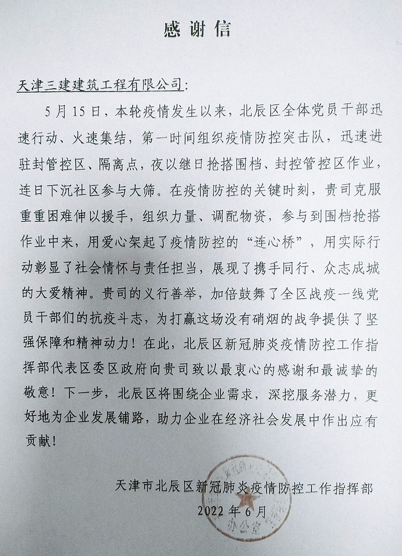 感謝信——天津市北辰區(qū)新冠肺炎疫情防控工作指揮部