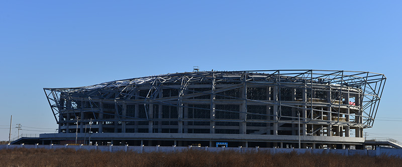 工程主體結(jié)構(gòu)形成為框架混凝土結(jié)構(gòu),主體一層,局部四層,主體砼柱分為兩圈,外圈砼柱共32根,柱頂標(biāo)高16.13至21.9米。內(nèi)圈不連續(xù)混凝土柱共26根(北側(cè)場館入口處抽空6根混凝土柱),柱頂標(biāo)高為20.14至21.9米。