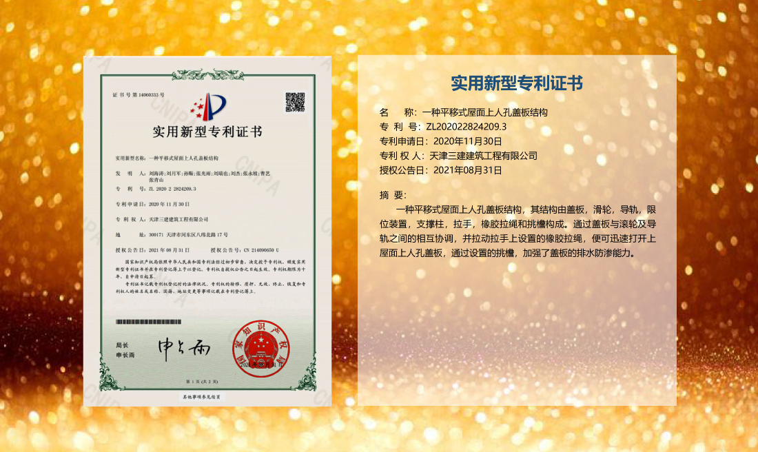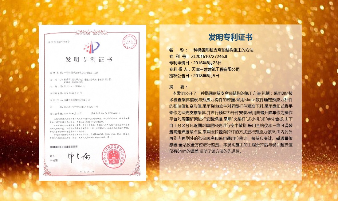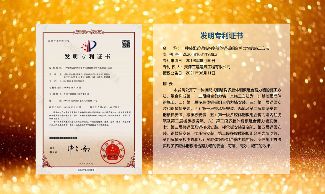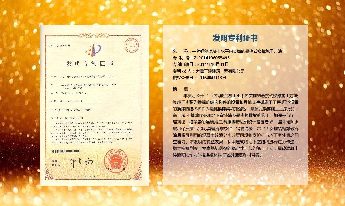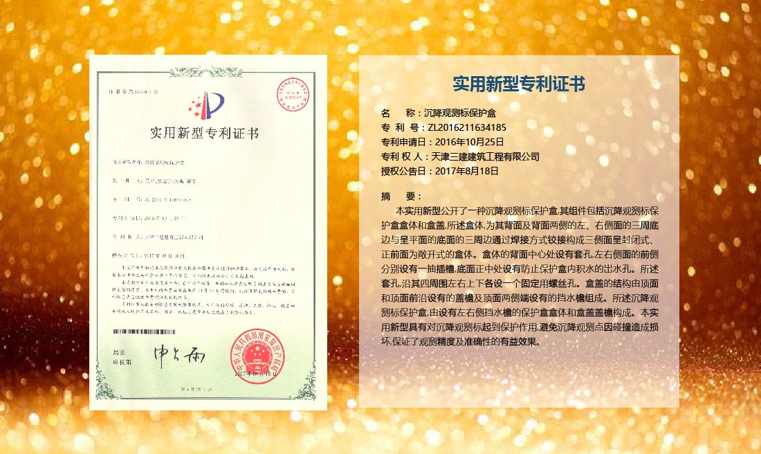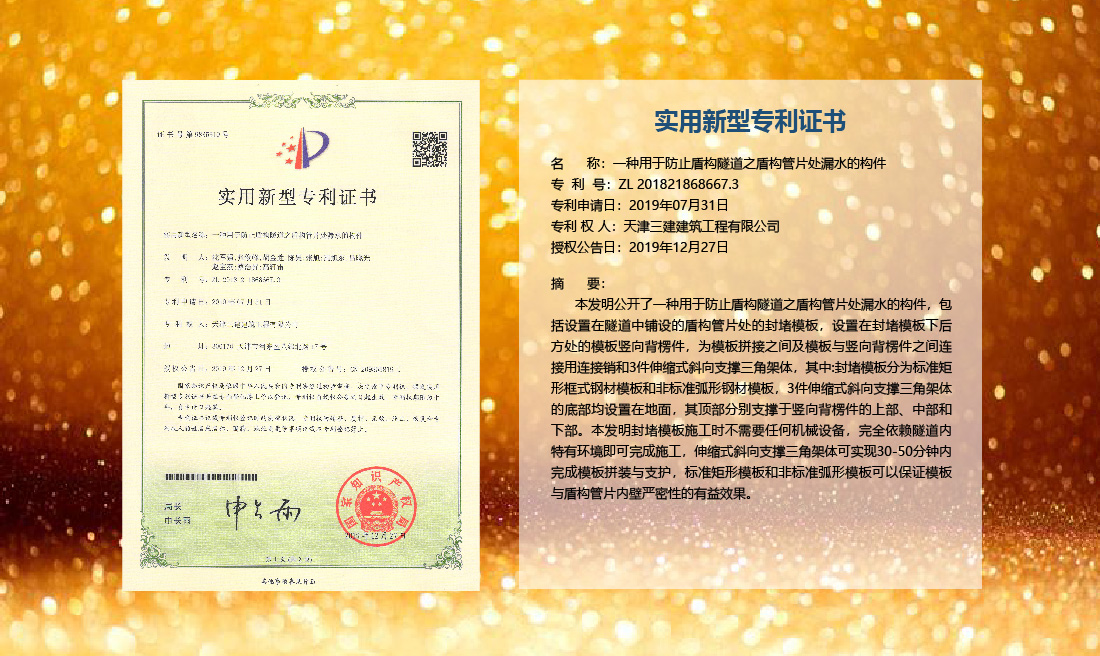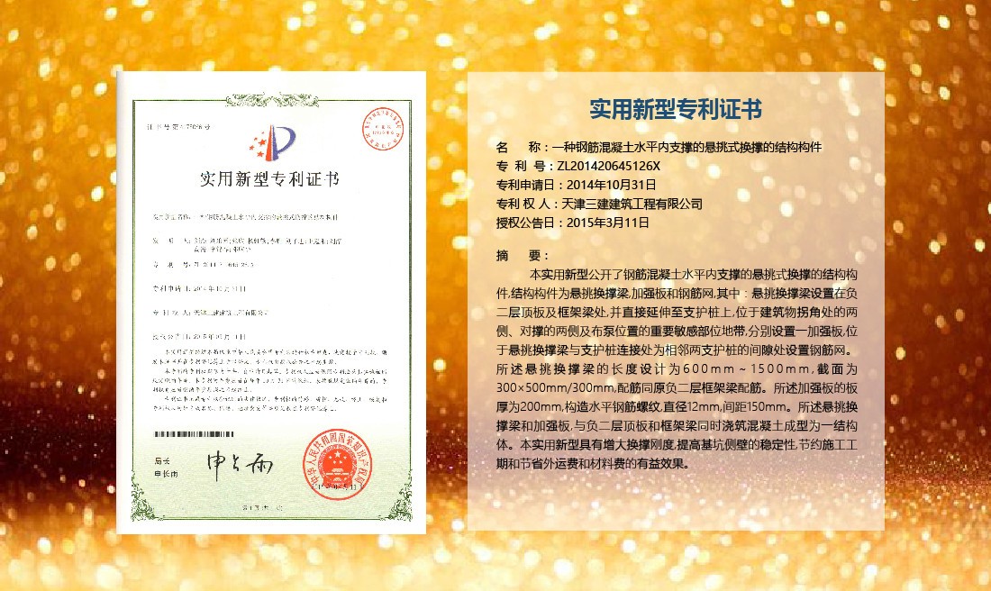 三建公司在總結(jié)施工經(jīng)驗(yàn)的基礎(chǔ)上,不斷發(fā)明創(chuàng)新,共獲得國家知識(shí)產(chǎn)權(quán)局授權(quán)專利71項(xiàng),其中,國家發(fā)明專利12項(xiàng),國家實(shí)用新型專利59項(xiàng)。囊括建筑、市政、巖土、道橋等多領(lǐng)域,凝聚了公司廣大工作人員的寶貴智慧和工程建筑者們的辛勤汗水。