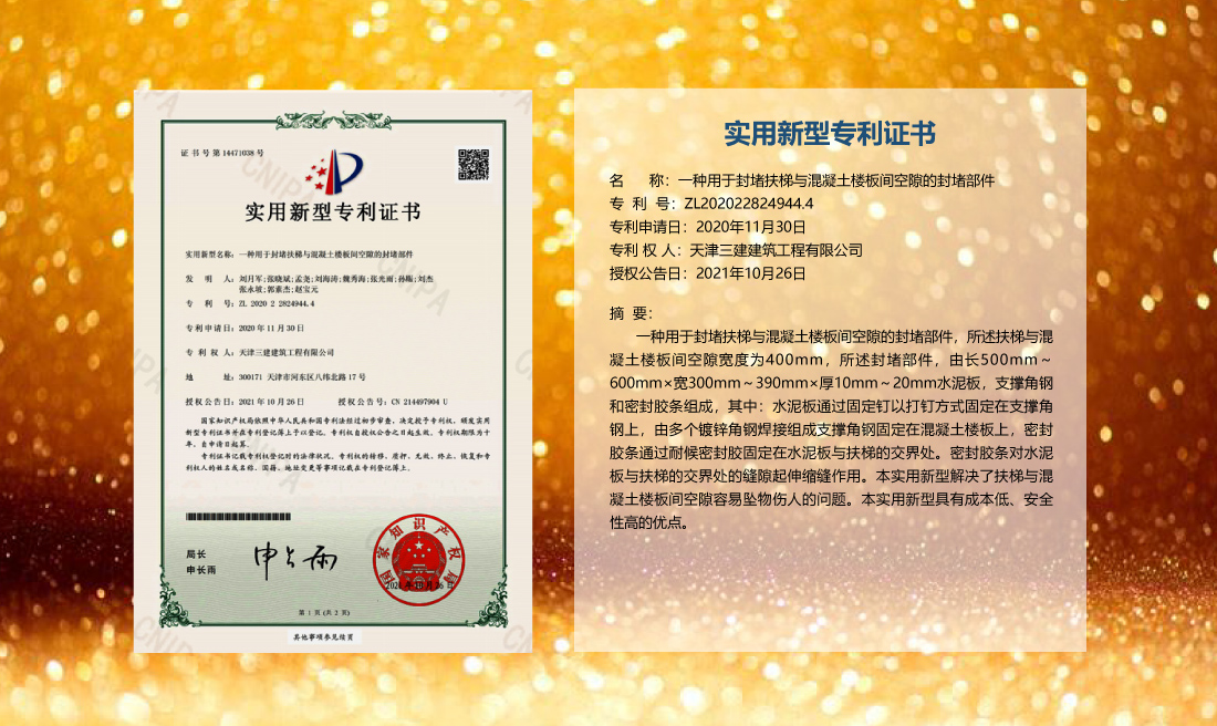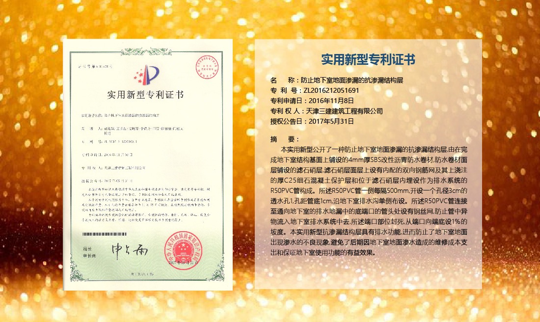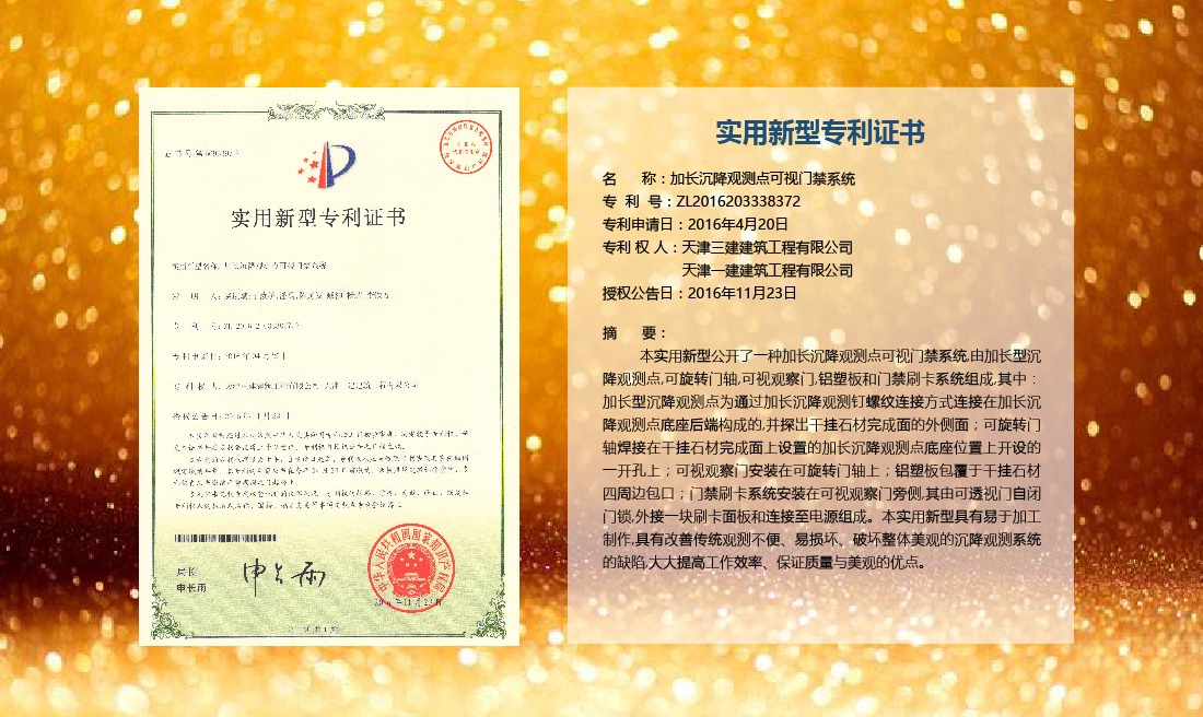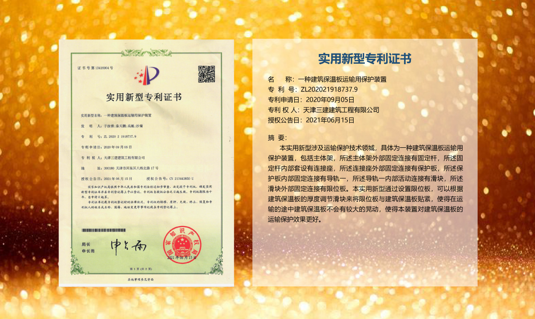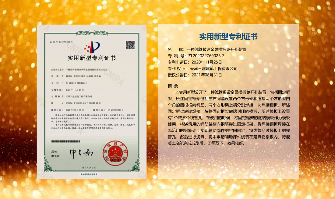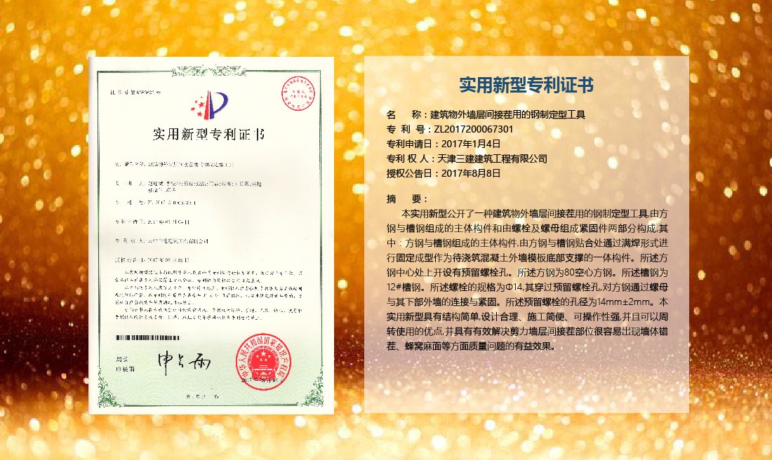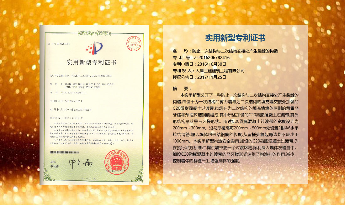 三建公司在總結(jié)施工經(jīng)驗(yàn)的基礎(chǔ)上,不斷發(fā)明創(chuàng)新,共獲得國家知識(shí)產(chǎn)權(quán)局授權(quán)專利71項(xiàng),其中,國家發(fā)明專利12項(xiàng),國家實(shí)用新型專利59項(xiàng)。囊括建筑、市政、巖土、道橋等多領(lǐng)域,凝聚了公司廣大工作人員的寶貴智慧和工程建筑者們的辛勤汗水。