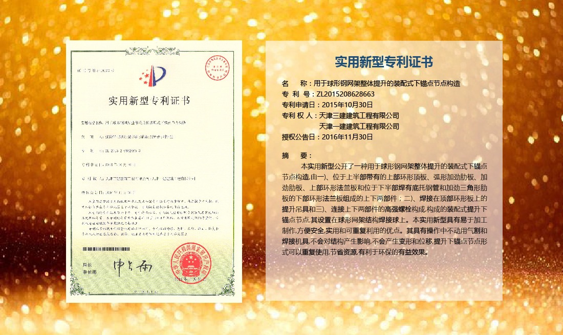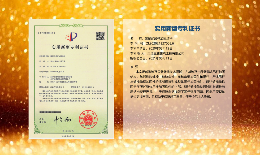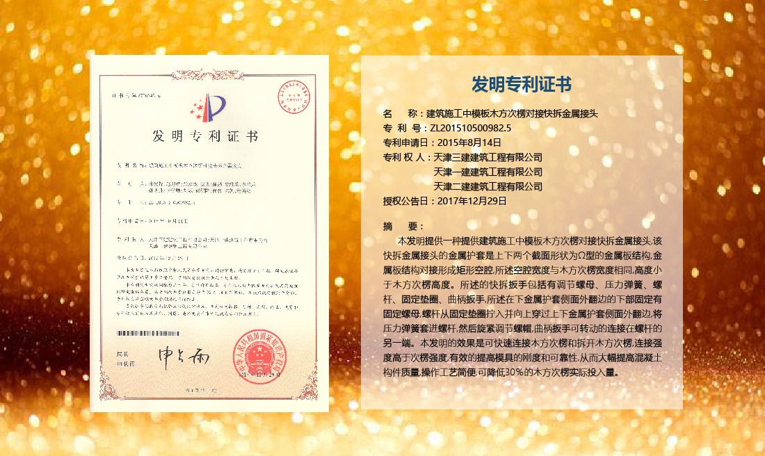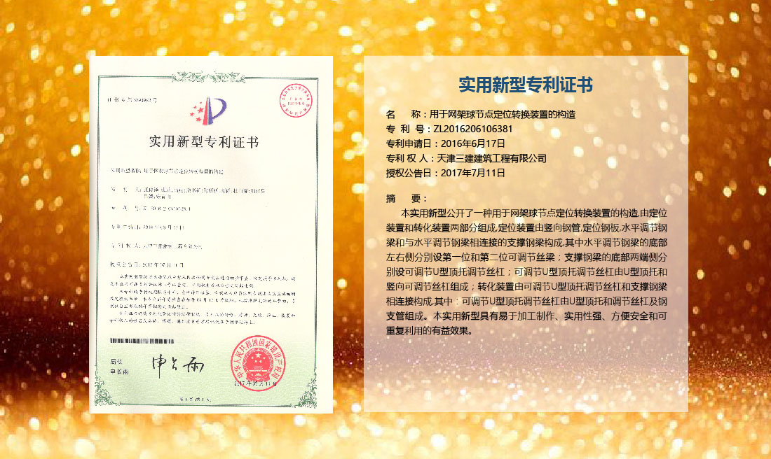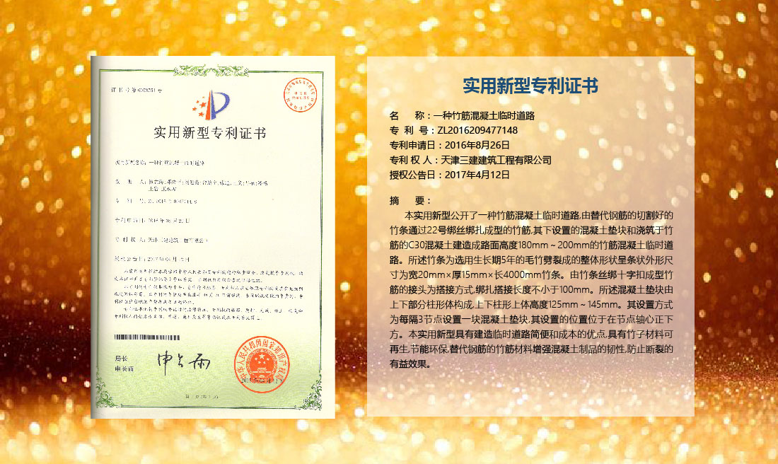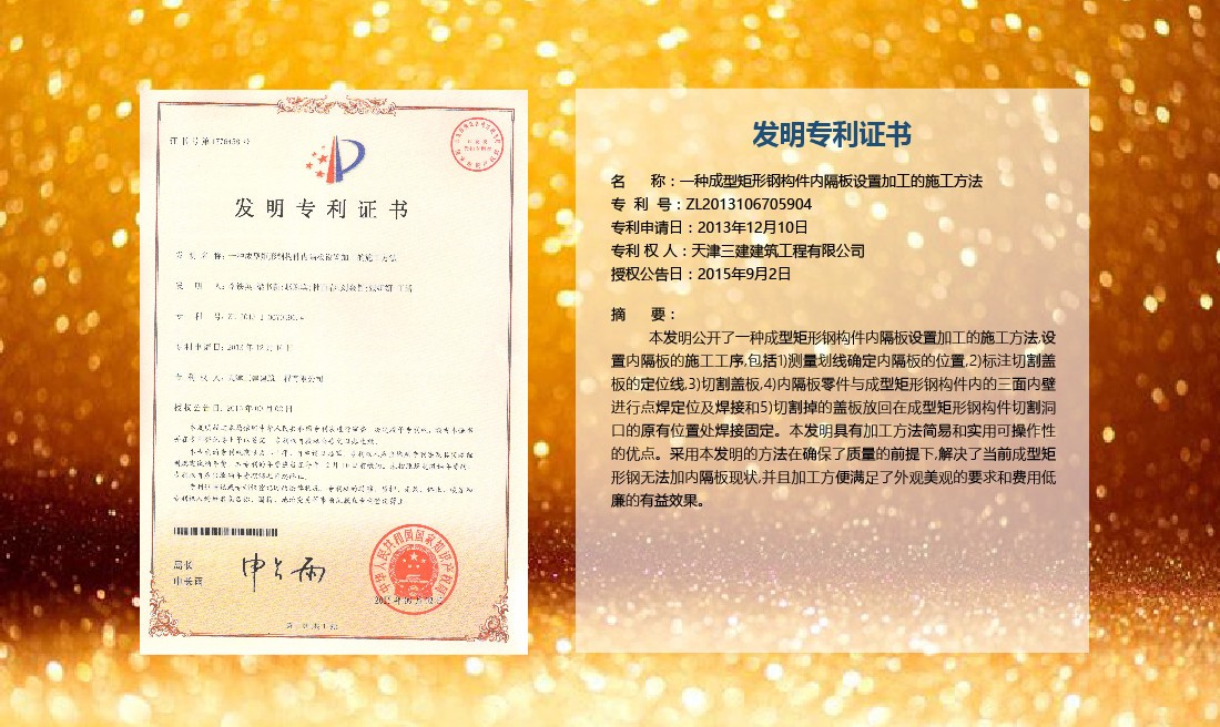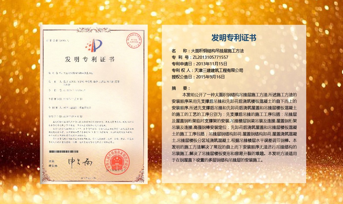 三建公司在總結(jié)施工經(jīng)驗(yàn)的基礎(chǔ)上,不斷發(fā)明創(chuàng)新,共獲得國家知識(shí)產(chǎn)權(quán)局授權(quán)專利71項(xiàng),其中,國家發(fā)明專利12項(xiàng),國家實(shí)用新型專利59項(xiàng)。囊括建筑、市政、巖土、道橋等多領(lǐng)域,凝聚了公司廣大工作人員的寶貴智慧和工程建筑者們的辛勤汗水。